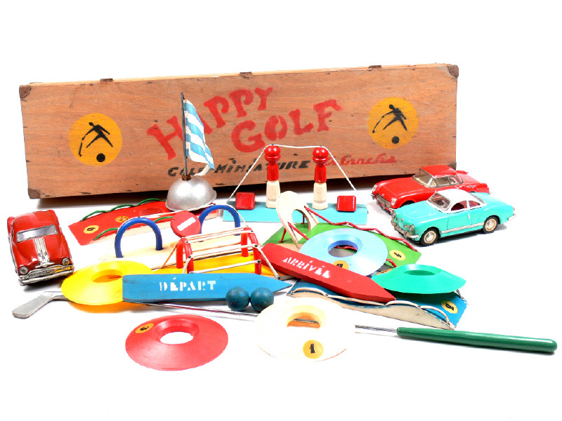 dimensions : 93 x 24 x 15 cm - contient différents éléments permettant de faire un parcours de mini-golf - avec manques - parties métalliques oxydées - on y joint 3 voitures à friction en tôle avec manques