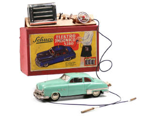 dimensions : 23 x 14,5 cm - contient : une voiture, un boîtier à pile, une télécommande à distance avec fil d'alimentation & cable de filoguidage, 2 clefs de démontage & un bouton plastique pour la commande manuelle de direction - avec cale de boîte (en partie déchirée) - manque fixation de trappe de boîtier à pile - pneus très légèrement affaissés