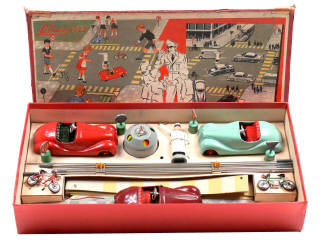 coffret réservé à l'exportation pour les Pays-Bas - contient : 2 voitures, 2 bicyclettes, un policier de la circulation avec son socle mécanique (fonctionne), 4 panneaux de signalisation, des éléments de rues & de trottoirs en carton, une clef & 6 tringles de commande à distance - on y joint une voiture supplémentaire (en état 'C' avec manques) ne faisant pas partie de ce coffret - cales de boîte présentes - BEL ENSEMBLE !