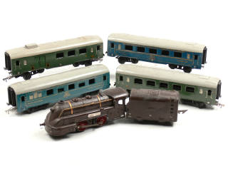 états de 'C' à 'D' - comprend une locomotive vapeur type 120 avec tender (manque un tampon), 4 voitures de voyageurs (dont une avec un boggie incomplet & essieu avec roues manquant) - quelques petites traces d'oxydation