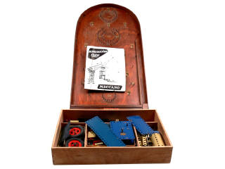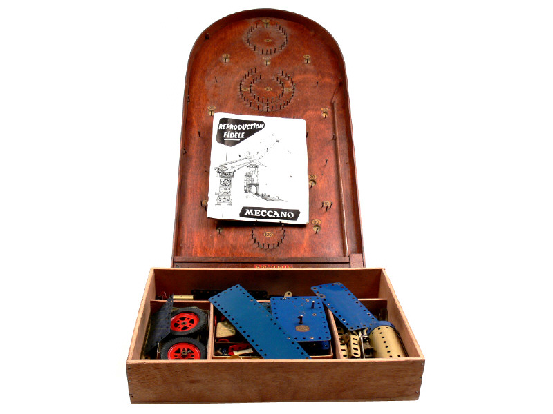 dimensions : 76 x 38,5 - ancêtre du flipper - avec 18 billes situées dans un logement avec trappe coulissante - traces d'oxydation sur les clous du plateau - on y joint un ensemble de pièces détachées en vrac de la marque MECCANO, un jeu de construction & un jeu de dominos en bois