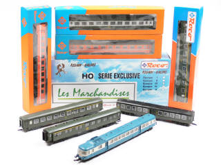 comprend : 7 voitures de voyageurs, un coffret de 6 wagons de marchandises & un autorail - quelques petits manques