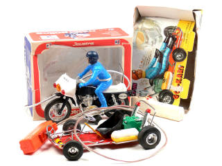 longueur 28 cm - moteur à piles (à revoir) - manque pilote, un décalque de réservoir & fermoir de télécommande