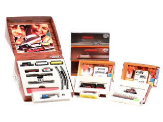série 'MINI-CLUB' - comprend : 4 locomotives vapeur, une motrice électrique, une motrice diesel, 6 wagons, une voiture de voyageurs & 2 aiguillages - 5 éléments regroupés dans un coffret avec rails & transformateur