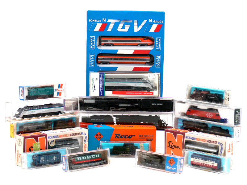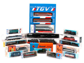 comprend : 6 locomotives vapeur, 3 motrices diesel, une rame TGV avec motrice, 2 motrices d'EUROTUNNEL, une motrice électrique, 7 wagons & une voiture de voyageurs - on y retrouve les marques : LIMA, ATLAS, ROCO, KATO, VAPEUR 70, RÖWA & RIVAROSSI