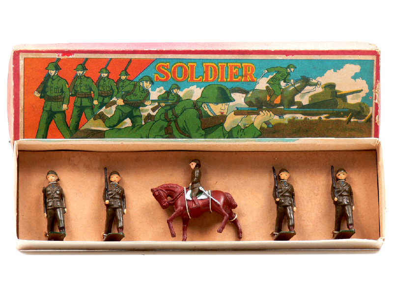 contient : un officier à pied, un officier à cheval & 3 soldats avec arme sur l'épaule - fabrication d'avant-guerre en métal - éléments ficelés sur cale de fond de boîte - SUPERBE !