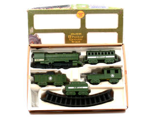 dimensions du coffret : 45 x 31 cm - contient une locomotive à vapeur (moteur à piles à revoir) avec tender, une voiture de voyageurs, un wagon-tombereau avec canon, un wagon caboose avec canon & 8 rails courbes - manque les 6 soldats - avec cale de présentation