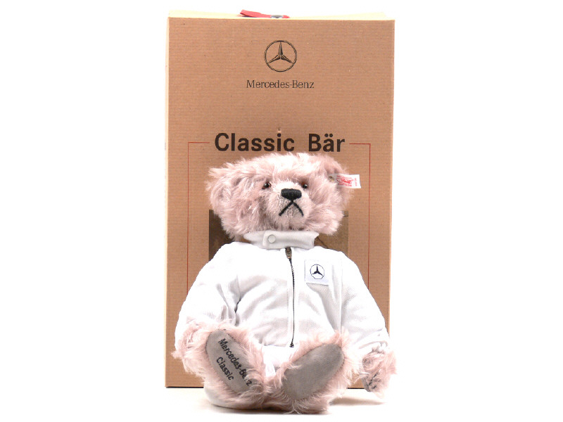 hauteur 33 cm - avec certificat d'édition limitée de 1999 numéroté 00422/1500 exemplaires dans son enveloppe - étiquette de la marque boutonnée sur l'oreille gauche, inscription 'MERCEDES-BENZ CLASSIC' brodée sous la patte arrière gauche & bruiteur