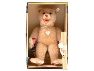 hauteur 32 cm - série limitée numérotée 01282/5000 exemplaires avec certificat & fiche d'instruction pour le libérer de sa boîte - étiquette de la marque boutonnée sur l'oreille gauche, médaillon cartonné de dénomination cousu sur la poitrine, mécanisme à distance de mouvements de la tête & macaron d'instructions fixé au dessus de la queue - on y joint un dépliant d'inscription au club STEIFF