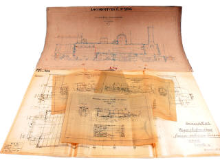 états de 'b' à 'c' - comprend des plans originaux de différentes dimensions sur papiers toilés & papiers calques représentant des locomotives vapeur, tenders, wagons, etc ... - période de 1847 aux années 1920 - ENSEMBLE EXCEPTIONNEL AVEC DES PIECES UNIQUES !
