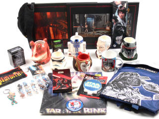 on y retrouve notamment : des tasses (dont une recollée), une maquette à monter (jamais ouverte), une peluche, un poster, une casquette, une trousse, des porte-clefs, des jeux de cartes, un tee-shirt, un sac à dos, 2 tableaux & une housse de couette