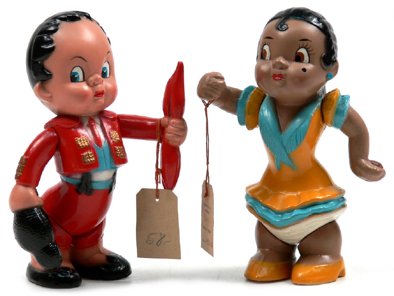 hauteurs 15,5 cm - représente un petit toréador & une joueuse de castagnettes - avec bras & jambes mobiles - étiquettes de taxe présentes sur chacune d'elles - fabrication vraisemblablement en celluloïd avec bruiteur