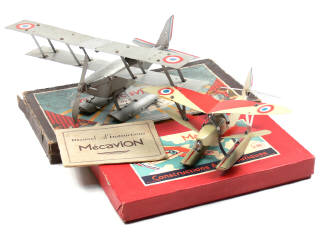 dimensions : 34,5 x 21 cm - ce coffret permettait la construction de 8 avions & hydravions - mention 'MEDAILLE D'OR CONCOURS LEPINE 1928' sur le couvercle - pièces en vrac dont certaines en parties oxydées - on y joint un hydravion assemblé ne faisant pas partie de ce coffret