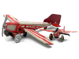 moteur à ressort (fonctionne) - manque 2 agrafes d'empennage - quelques traces d'oxydation (notamment sur le moteur) - système de fixation d'aile non d'origine - on y joint un petit monoplan à ailes repliables de marque la marque KELLERMAN en état 'D' avec retouches, parties repeintes & traces d'oxydation - manque une partie de la tête du pilote