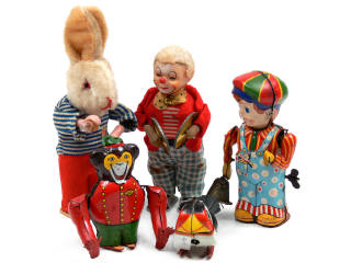états de 'B' à 'D' - comprend un clown, un lapin, un singe, un oiseau & un garçonnet - on y retrouve notamment les marques : JOUSTRA, LEHMANN & KFS - tous les mécanismes fonctionnent - une figurine avec éléments manquants & une autre avec un élément incomplet