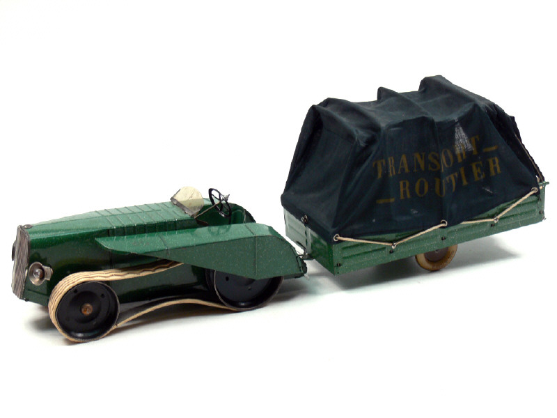 longueur 68 cm - modèle produit en 1935/1936 - moteur à clef (non testé) - équipé de phares électriques (à revoir) - la bâche est en toile bleu marine - chenilles non d'origine - rondelle de maintien de volant désolidarisée de son axe