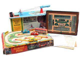dimensions : 50 x 35 x 7 cm - avec 3 voitures de course - quelques traces d'oxydation sous le circuit - on y joint un jeu 'AUTOBRIDGE' en état 'A.d'