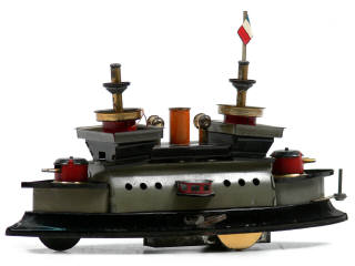 longueur 21 cm - moteur à ressort avec système permettant de simuler le tangage (fonctionne) - avec crochet pour fixer une flotille de 4 navires supplémentaires - manque une passerelle latérale - modèle dont la base est la copie conforme de celui réalisé par BING avec quelques modifications concernant les superstructures & les tourelles de canon - compte tenu de l'état, il s'agirait d'une fabrication beaucoup plus récente