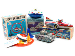 comprend 2 soucoupes-volantes & un engin intergalactique - on y retrouve notamment les marques : MODERN TOYS & TOMY - on y joint un CHAR LOOPING de marque FRANCE JOUETS en état 'D' avec trappe de compartiment à pile manquante