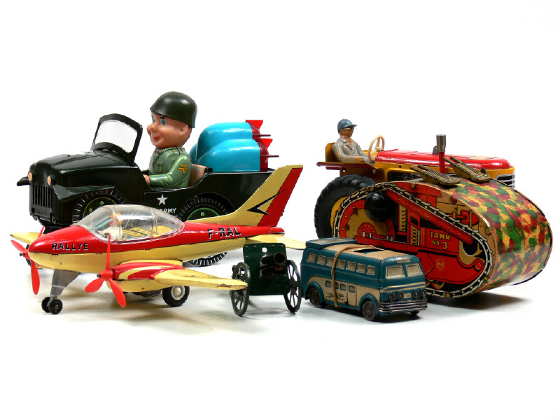 états de 'B' à 'D' - comprend : une JEEP 'US ARMY', un tracteur agricole, un avion monoplan bimoteur 'RALLYE, un autocar 'BROADWAY', un char d'assaut & un canon - un moteur à piles à revoir & un moteur à clef avec quelques fonctions déficientes - on y retrouve notamment les marques : JOUSTRA, MODERN TOYS & MARX TOYS - quelques traces d'oxydation sur certains modèles