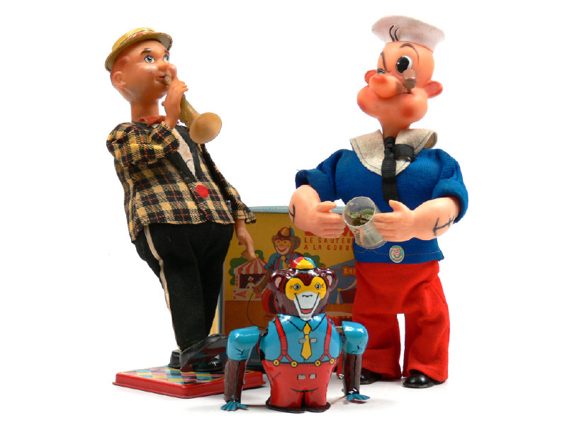 hauteur 27 cm - moteur à ressort (fonctionne) - en action, le trompettiste remue en avant & en arrière sur sa jambe gauche, fait bouger sa tête tandis que son chapeau se soulève - manque fil de rattachement de la main à la trompette - vêtements poussiéreux