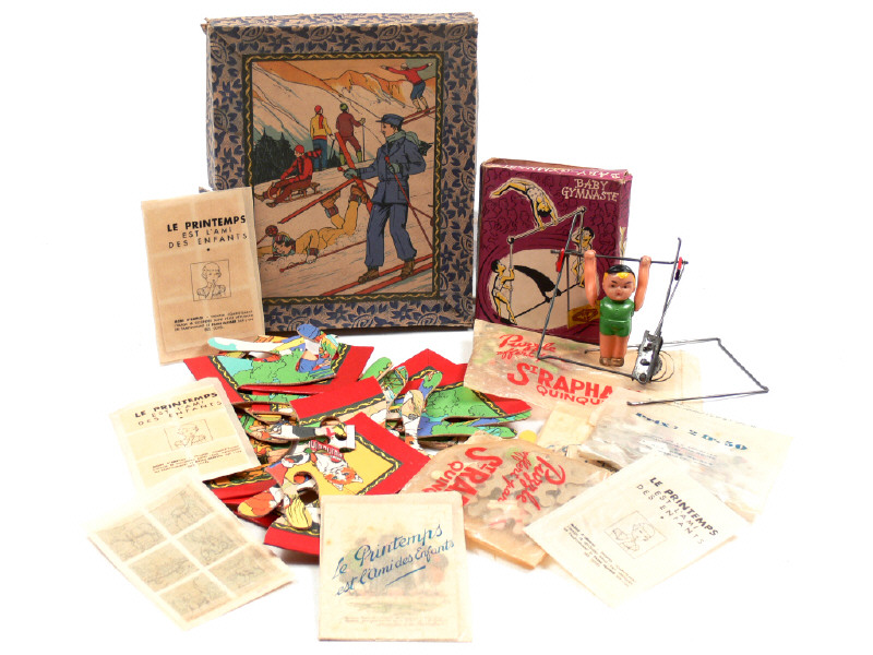 comprend : différents puzzles (dont la plupart offerts par SAINT RAPHAËL & LE PRINTEMPS) - on y joint un jouet 'BABY GYMNASTE de la marque GASPARD & GAUBIER (avec personnage en celluloïde, parties métalliques désolidarisées) & 4 pochettes de décalcomanies offertes par les magasins du PRINTEMPS