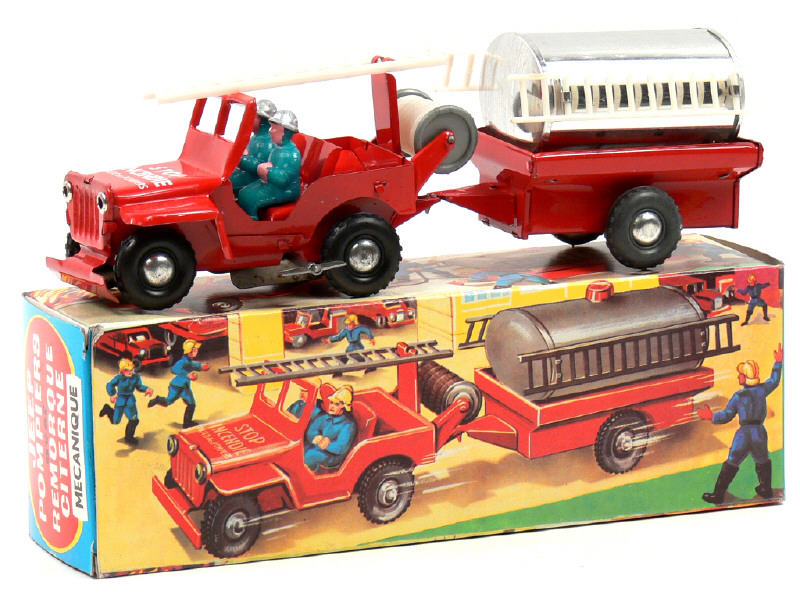 JOYAX (FRANCE) JEEP de pompiers avec remorque-citerne en tôle rouge