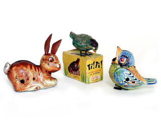 états de 'A' à 'C' - comprend : 2 oiseaux & un lapin - on y retrouve les marques : GEGE (modèle en plastique, fendu & recollé, avec boîte état 'c') & JOUSTRA (manque un élément du bec) - moteurs à ressort (un seul fonctionne)