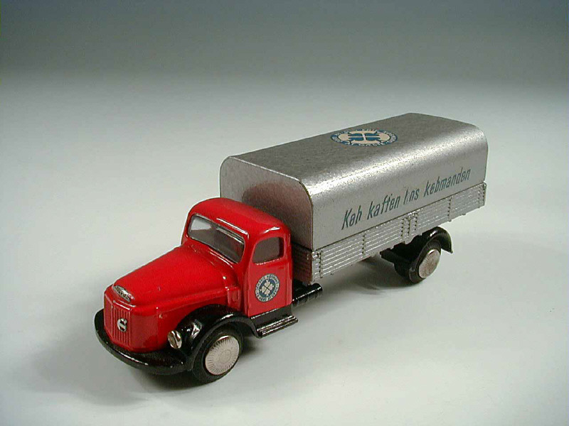 TEKNO (DANEMARK) 438 VOLVO Camion-plateau bâché 'DEN FRIE KØBMAND' rouge & argent