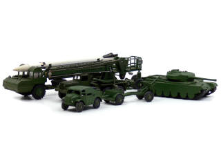 on y retrouve les modèles : lance-fusée CORPORAL avec sa plate-forme de lancement, camion-nacelle, CHAR CENTURION (canon légèrement tordu) & tracteur d'artillerie avec caisson à munitions & canon tracté)