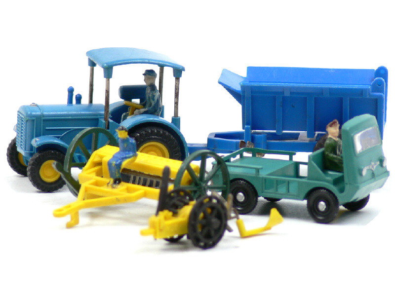 états de 'A' à 'C' - comprend : un tracteur HANOMAG (parties nickelées oxydées & carrosserie décolorée), une remorque benne-basculante à un essieu (manque ridelle), un râteau à foin (avec personnage) & un brise-mottes rotatif - on y joint un chariot électrique MEILI AGROMOBIL