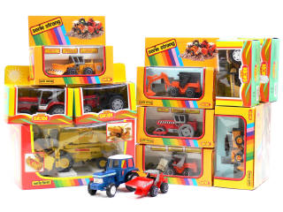 comprend : un chariot élévateur, une chargeuse sur pneus, un tracteur à benne basculante, un tracteur chasse-neige, un tracteur à benne excavatrice, un rouleau-compresseur, une moissonneuse-batteuse NEW HOLLAND & 4 tracteurs agricoles des marques MASSEY-FERGUSON, MARSHALL, FORD & CASE INTERNATIONAL - quelques boîtes en état 'c'