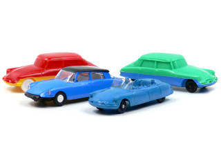 états de 'A' à 'C' - comprend 3 berlines dont 2 en plastique souple & un cabriolet en caoutchouc - on y retrouve les marques : KDN (déformation du plancher), FALK (un modèle avec axes de roues oxydés) & TOMTE