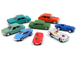états de 'B' à 'C' - miniatures reproduisant les marques : RENAULT, FIAT, PEUGEOT, MATRA, GORDINI, JAGUAR, MERCEDES & VOLKSWAGEN - quelques jantes fondues - une carrosserie en partie décolorée