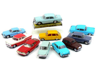 états de 'B' à 'C' - miniatures reproduisant les modèles : SIMCA, PANHARD, RENAULT, VOLKSWAGEN, PEUGEOT, MERCEDES & CITROEN - un véhicule avec boîte - quelques jantes fondues - 2 carrosseries légèrement déformées