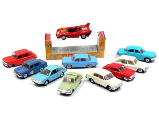 états de 'B' à 'C' - miniatures reproduisant les modèles : SIMCA, PANHARD, RENAULT, PEUGEOT, CITROEN & FERRARI - un véhicule avec boîte - quelques jantes fondues - 4 carrosseries légèrement déformées - une voiture avec petits détails de peinture rouge ajoutés sur les feux avant & 2 autres avec suspensions avant affaissées
