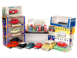 on y retrouve les marques : MINISTYLE, VANGUARDS, GUISVAL, CGGC, POLISTIL, REVELL, PLAYART, WELLY, AR-GEE, HONGWELL & divers - manque un pare-brise & 2 rétroviseurs - présence de 9 boîtes en état 'b'