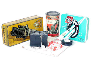 états de 'B' à 'E' - comprend 3 boîtes en tôle (MARCHAL, MICHIGAN & REMA), une batterie DININ, un briquet DUNLOP, une épingle MERCEDES & un carreau de faïence CALTEX