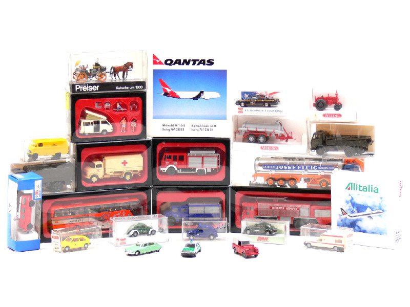 petites échelles - miniatures reproduisant notamment les modèles : CITROËN, CHEVROLET, LANZ, LAND ROVER, MERCEDES, STEYR & VOLKSWAGEN - on y retrouve les marques : HERPA, BUSCH, ROCO, MAAG, PREISER, WIKING & BREKINA - 3 véhicules sans boîte