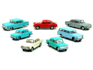 miniatures reproduisant les modèles : FORD, LANCIA, OPEL, PEUGEOT, SIMCA (2 exemplaires différents) & VOLKSWAGEN - quelques petites fêlures