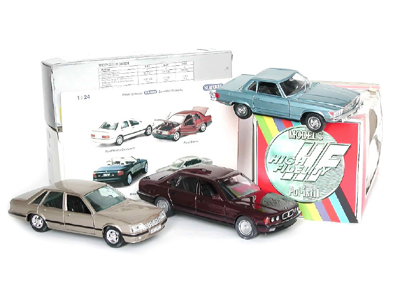 échelle 1/24ème - miniatures reproduisant les modèles : MERCEDES, BMW & OPEL - on y retrouve les marques : POLISTIL, SCHABAK & GAMA - manque une cale de boîte