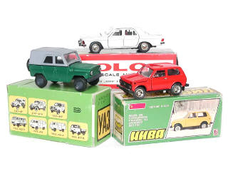 miniatures reproduisant les modèles : VOLGA, LADA & UAZ - on y retrouve notamment la marque SARATOV - un entourage de pare-brise cassé - une boîte en état 'c'