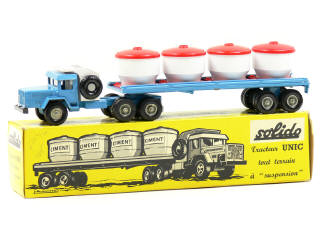SOLIDO (FRANCE) 301 UNIC Semi-remorque plateau transport de ciment bleu, blanc & rouge