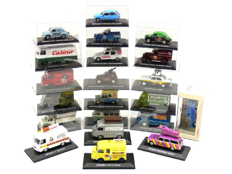 miniatures reproduisant les modèles : AUSTIN, CITROËN, PEUGEOT, RENAULT & SIMCA - on y retrouve notamment les publicités : CASINO, BUTAGAZ, AU BOEUF AGILE, CIRAGE ABEILLE, CA VA SEUL, LUSTUCRU, GALERIES LAFAYETTE & GRANDS MOULINS DE PARIS - on y joint un classeur avec 23 fascicules