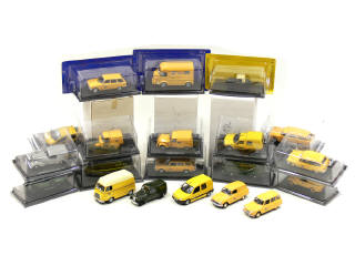 miniatures reproduisant les modèles : CITROËN, HOTCHKISS, LAMBRETTA, PEUGEOT, RENAULT & SIMCA - on y joint un classeur avec 20 fascicules & une sacoche de courrier - 13 véhicules sans socle de boîte - un rétroviseur manquant