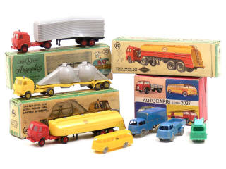 états de 'A' à 'C' - échelle approximative 1/75ème - contient un autocar, un camion-plateau, un camion bâché (axes de roues oxydés) & un camion grande échelle