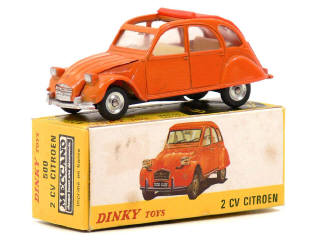 DINKY TOYS (FRANCE) 500 CITROËN 2CV Décapotée (made in SPAIN) orange avec plancher vissé & plaque minéralogique arrière argent