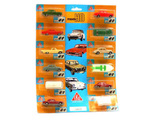 échelle 1/86ème - miniatures reproduisant les modèles : BMW, CHEVROLET, CITROËN, FORD, MERCEDES, OPEL, ROVER & STUDEBAKER - comprend également une caravane & un bateau sur remorque - chaque emballage se détache permettant la vente des véhicules à l'unité