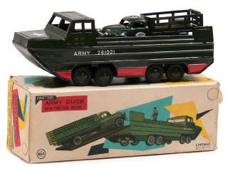 LINE MAR TOYS (JAPON) J-1508 ARMY DUCK WITH FRICTION TRUCK kaki & rouge