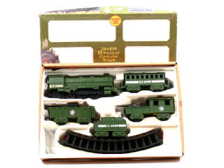 dimensions du coffret : 45 x 31 cm - contient une locomotive à vapeur (moteur à piles à revoir) avec tender, une voiture de voyageurs, un wagon-tombereau avec canon, un wagon cabosse avec canon & 8 rails courbes - manque les 6 soldats - avec cale de présentation